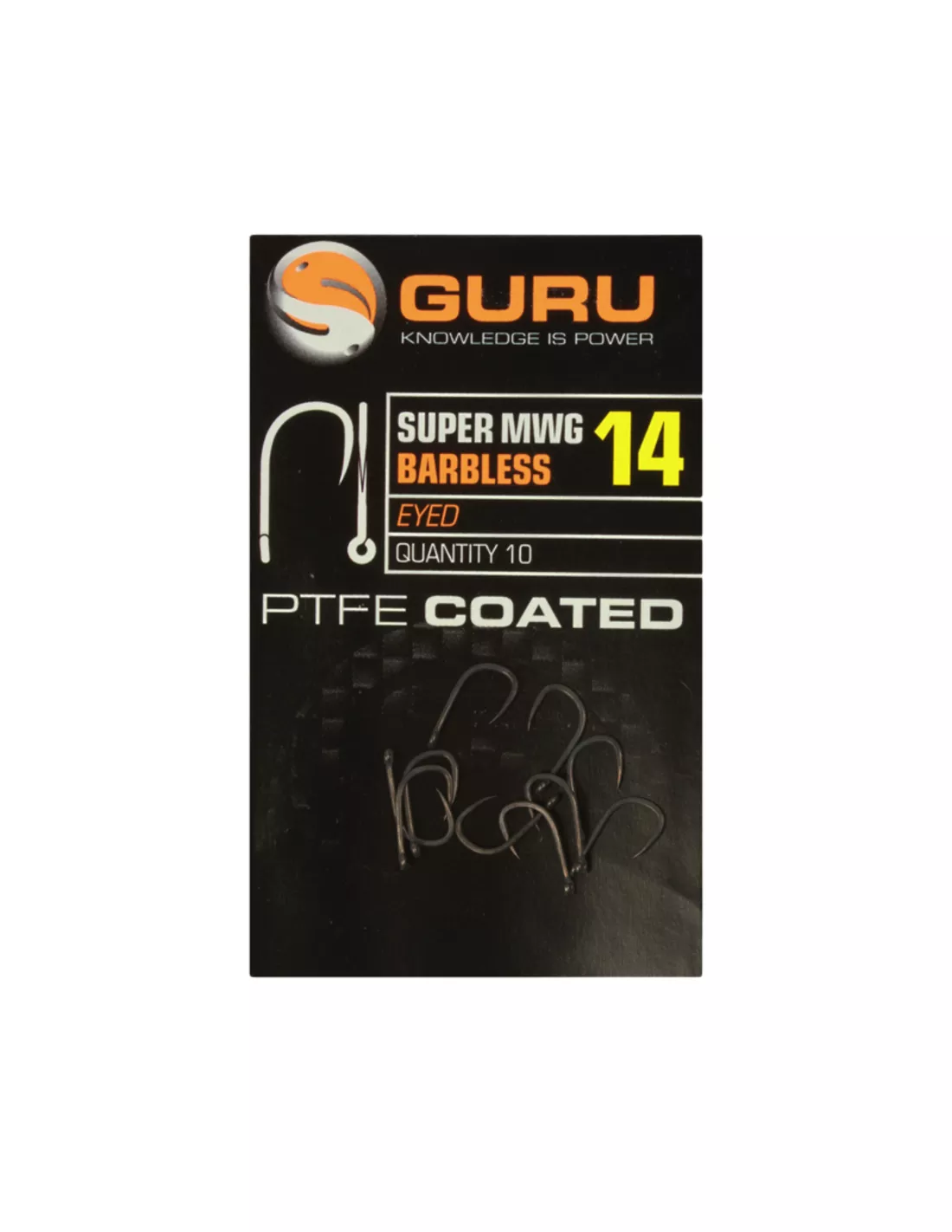 De Guru Super MWG Hook is voorzien van een PTFE coating en is een geweldige allround haak die zich laat lenen voor de visserij met de vaste hengel, maar ook met de (method)feeder. Deze weerhaakloze haak is ijzersterk en zeer scherp. De Guru Super MWG Hook is verkrijgbaar in verschillende maten.Â