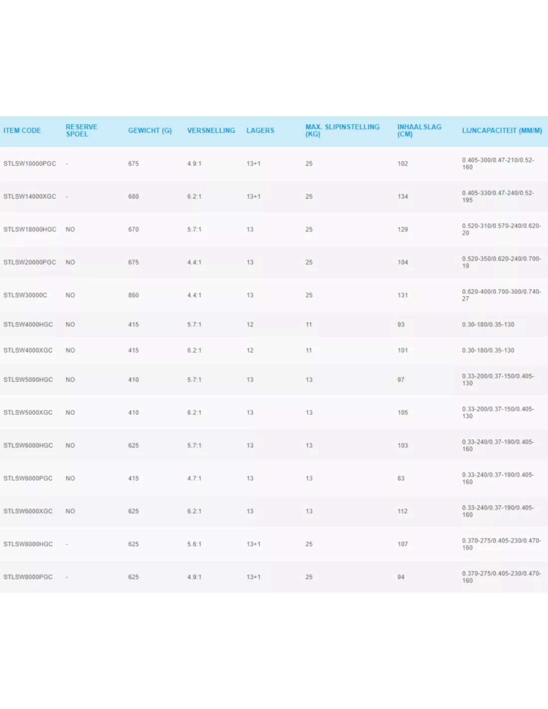 De STELLA SW heeft geen verdere introductie nodig: het is Shimano’s meest high-end, duurzame, sterkste en krachtigste spinning molen welke overal ter wereld bekend staat om zijn kwaliteit. Deze molen is verbeterd op een aantal punten: hij is nóg sterker, duurzamer en krachtiger. De STELLA SW is gemaakt om zeer sterke en krachtige vis te kunnen weerstaan en is dus bij uitstek geschikt voor het vissen op grote zoutwater soorten. De serie beschikt over verschillende maten en gear ratio’s, voor verschillende technieken en doeleinden.